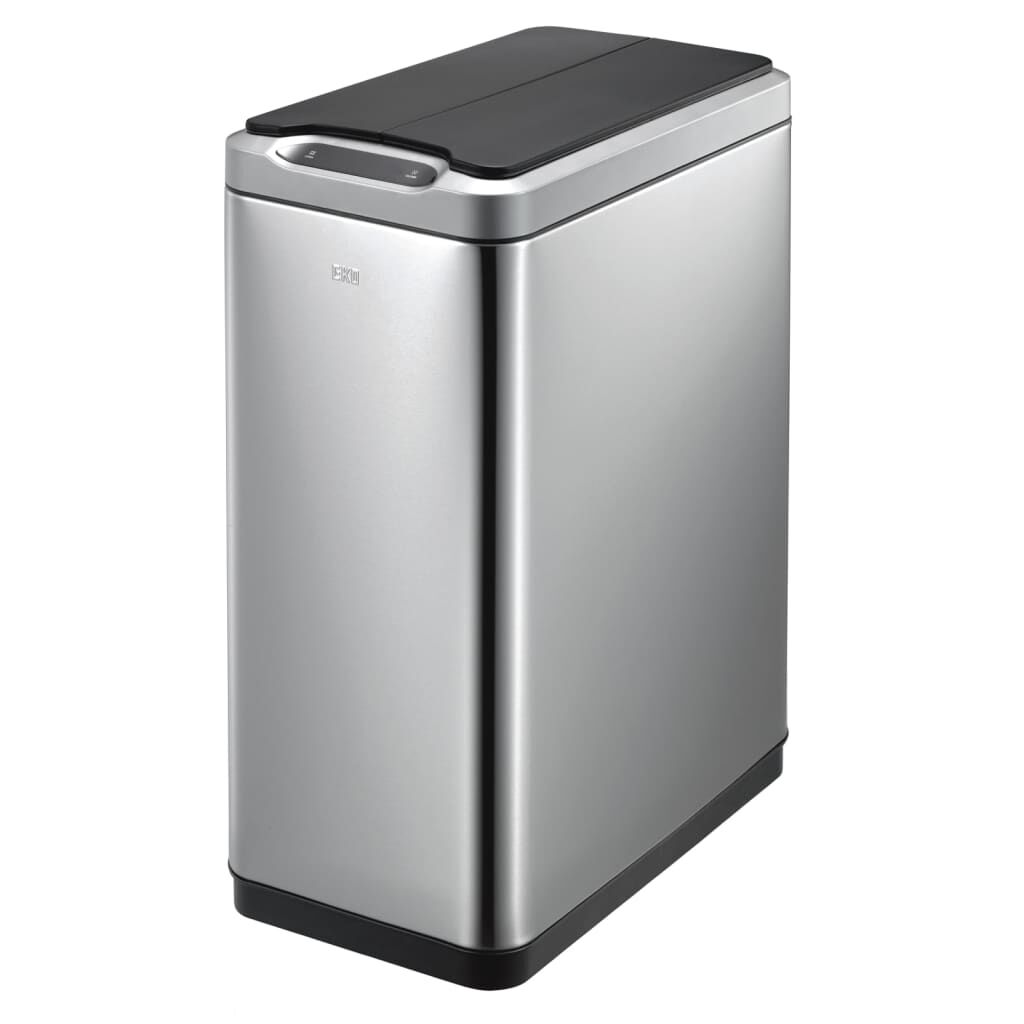 Der Sensormechanismus mit Berührungsschalter ermöglicht das Öffnen und Schließen des Behälters entweder durch einen Sensor oder durch Berühren einer Taste. Das schlanke Design macht es perfekt für kleine Räume. Der geräuschlos schließende Deckel öffnet sich in zwei Teilen, sodass sich der Mülleimer leicht unter Arbeitsplatten montieren lässt.